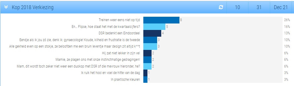 Nog een jubileum! Het is het tweede jaar van de “Kop van het Jaar” verkiezing. Vorige jaar won Ilona met “Poulet Luviennaise”. Dit jaar heeft Ad Hok gewonnen met “Treinen weer eens niet op tijd“.